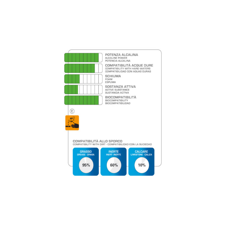 Prodotto alcalino bifasico super concentrato, composto da una miscela di sequestranti, sali alcalini e tensioattivi non ionici, studiato per il rapido lavaggio di autoveicoli tramite sistema di irrorazione con nebulizzatore a bassa pressione e successivo risciacquo con idropulitrice. Non è necessario spugnare o spazzolare. Ideale anche per la pulizia di autocarri, telai, autocisterne, motori, cerchioni, teloni, e per rimuovere macchie persistenti di grasso, smog e terriccio. NON ADATTO PER CABINE.